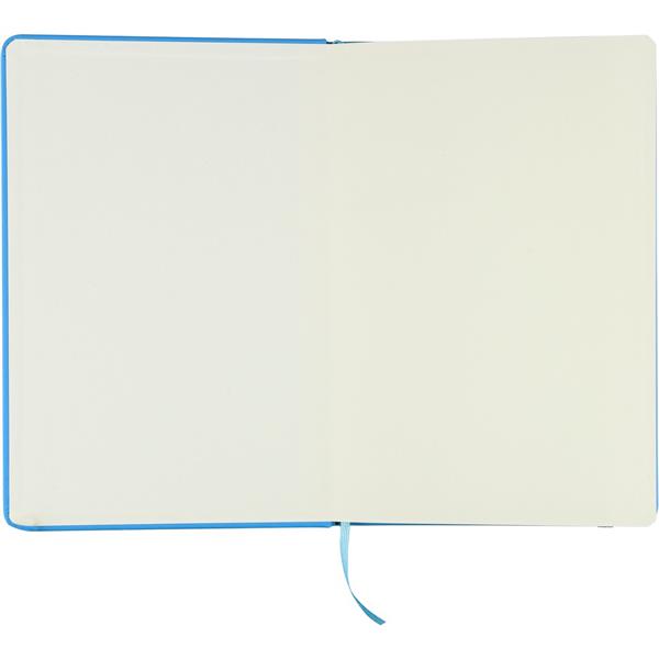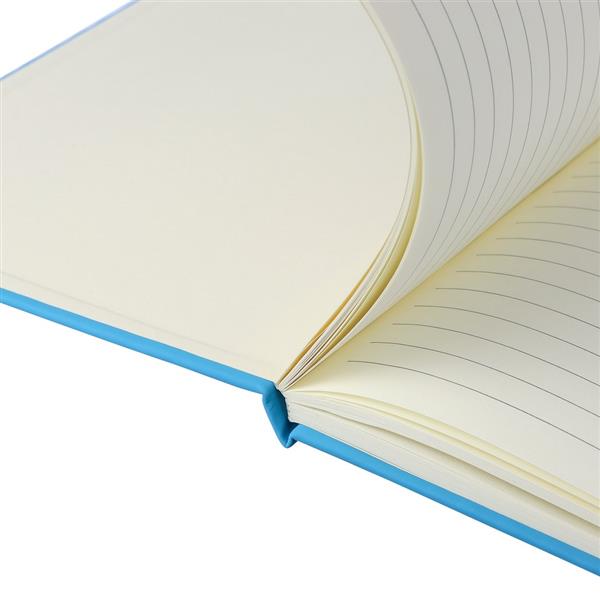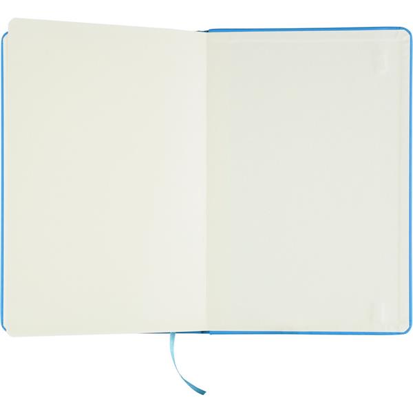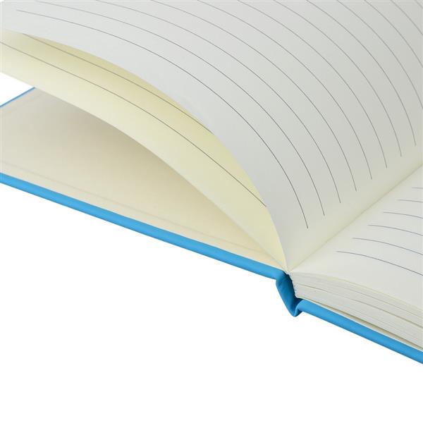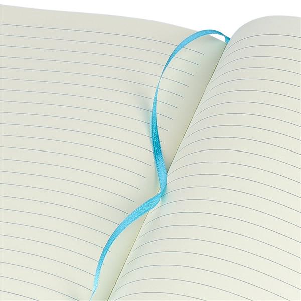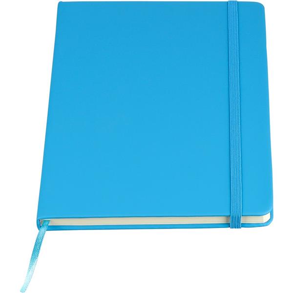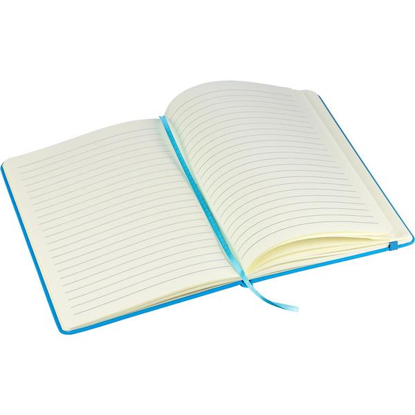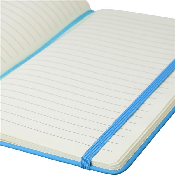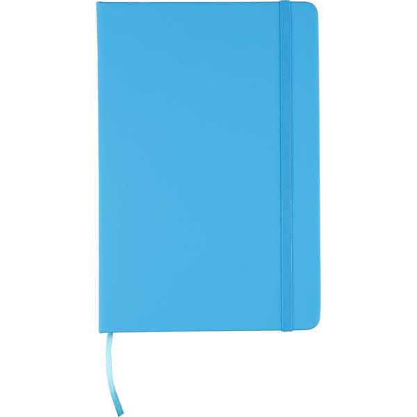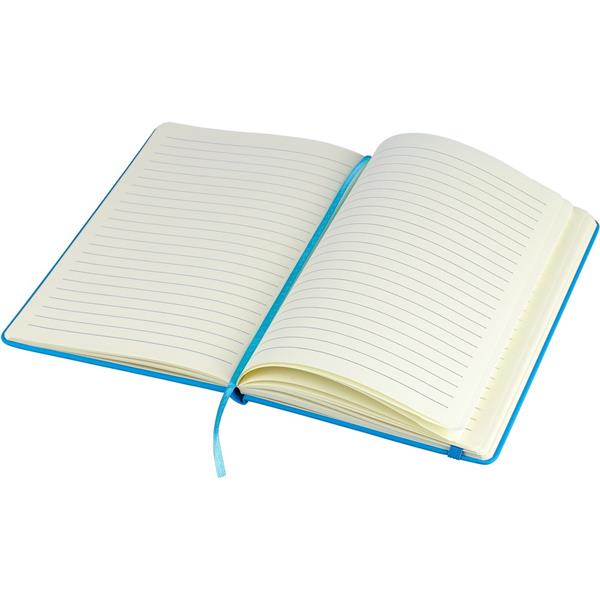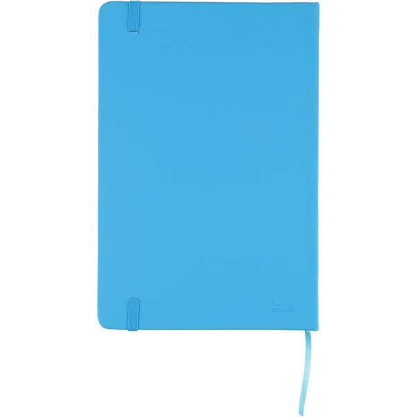 Notatnik ok. A5 RPET, z twardą okładką wykonaną z RPET PU, zawierający 80 stron w linie (70 g/m2), tasiemka zakładkowa umożliwia wygodne zaznaczanie ostatniej strony lub ważniejszych notatek, dodatkowe zamknięcie w postaci kolorowej elastycznej opaski, ikona recyklingu na tylnej stronie