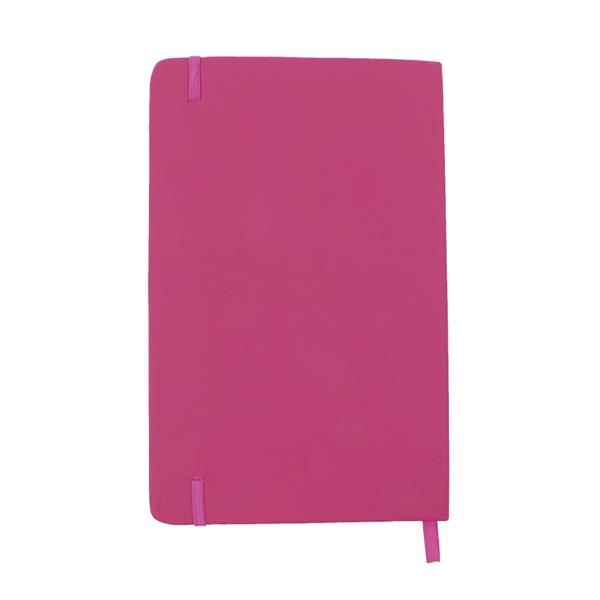 Notatnik w formacie ok. A5, posiada 96 kartek w linie (192 strony), tasiemka zakładkowa umożliwia wygodne zaznaczanie ostatniej strony lub ważniejszych notatek, dodatkowe zamknięcie w postaci dopasowanej kolorystycznie elastycznej opaski, twarda okładka wykonana z PU