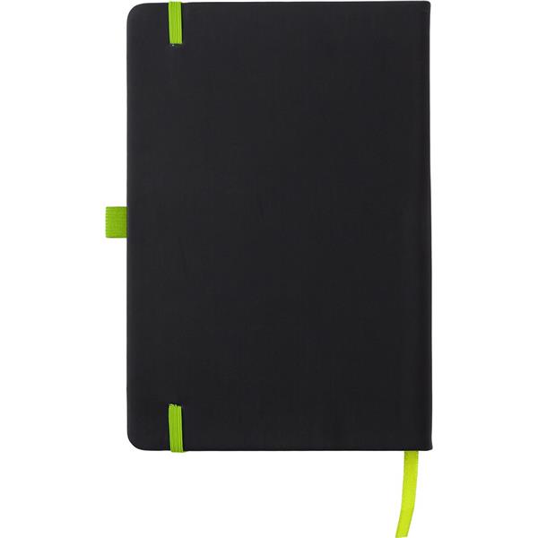 Notatnik (ok. A5, 96 kartek w linie), tasiemka zakładkowa i elastyczna opaska do zamykania, grawer ukazuje powierzchnię w kolorze opaski do zamykania