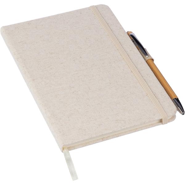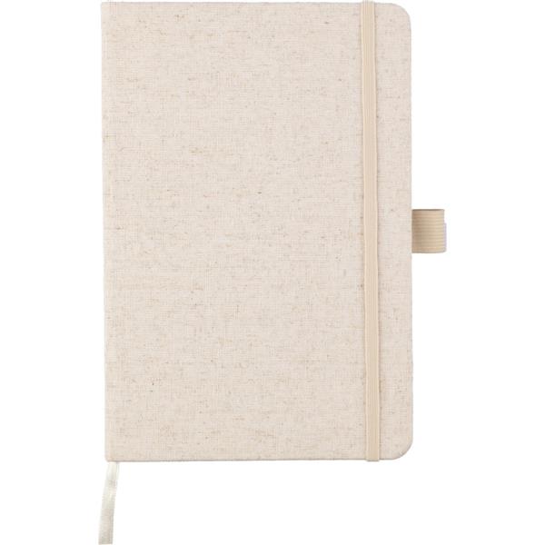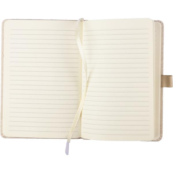 Notatnik ok. A5, posiada 80 stron w linie, tasiemka zakładkowa umożliwia wygodne zaznaczanie ostatniej strony lub ważniejszych notatek, dodatkowe zamknięcie w postaci dopasowanej kolorystycznie elastycznej opaski, posiada otwór na długopis, zmieści się do szkolnego plecaka, ikona konopi na produkcie, produkt wykonany z konopi