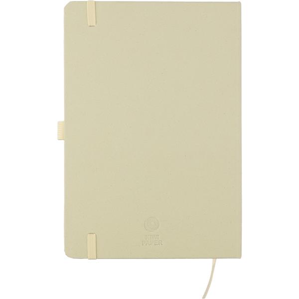 Notatnik w formacie ok. A5, posiada 80 stron w linie drukowanych tuszem sojowym, tasiemka zakładkowa umożliwia wygodne zaznaczanie ostatniej strony lub ważniejszych notatek, dodatkowe zamknięcie w postaci dopasowanej kolorystycznie elastycznej opaski, zmieści się do szkolnego plecaka, notatnik posiada papierową okładkę Favini pochodzącą z Włoch, ikona surowca na produkcie, produkt wykonany z kartonu i resztek produkcyjnych (04 – lawenda, 05 – wiśnia, 06 – cytrusy, 18 – migdały, 25- winogrona) oraz papieru 70 g/m2