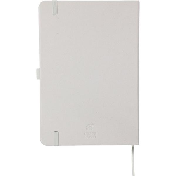 Notatnik w formacie ok. A5, posiada 80 stron w linie drukowanych tuszem sojowym, tasiemka zakładkowa umożliwia wygodne zaznaczanie ostatniej strony lub ważniejszych notatek, dodatkowe zamknięcie w postaci dopasowanej kolorystycznie elastycznej opaski, zmieści się do szkolnego plecaka, notatnik posiada papierową okładkę Favini pochodzącą z Włoch, ikona surowca na produkcie, produkt wykonany z kartonu i resztek produkcyjnych (04 – lawenda, 05 – wiśnia, 06 – cytrusy, 18 – migdały, 25- winogrona) oraz papieru 70 g/m2