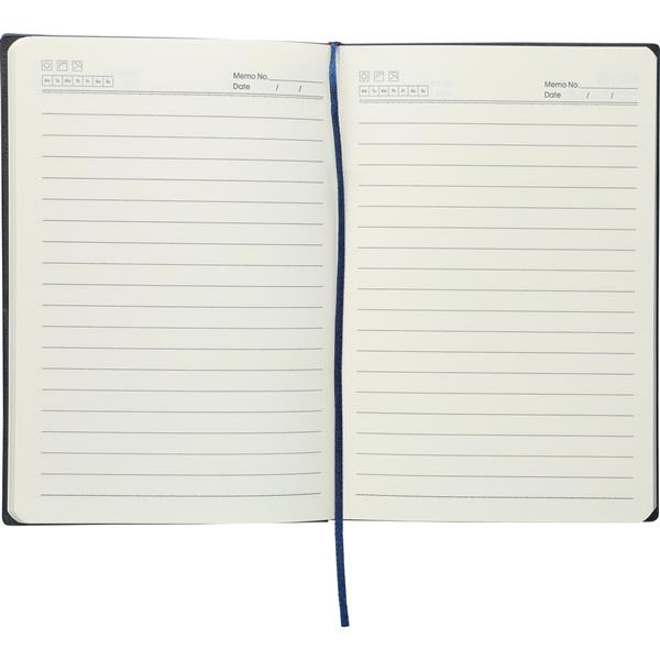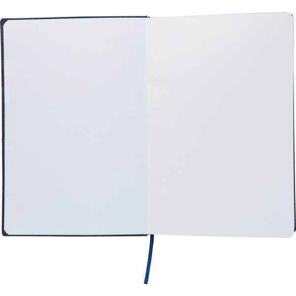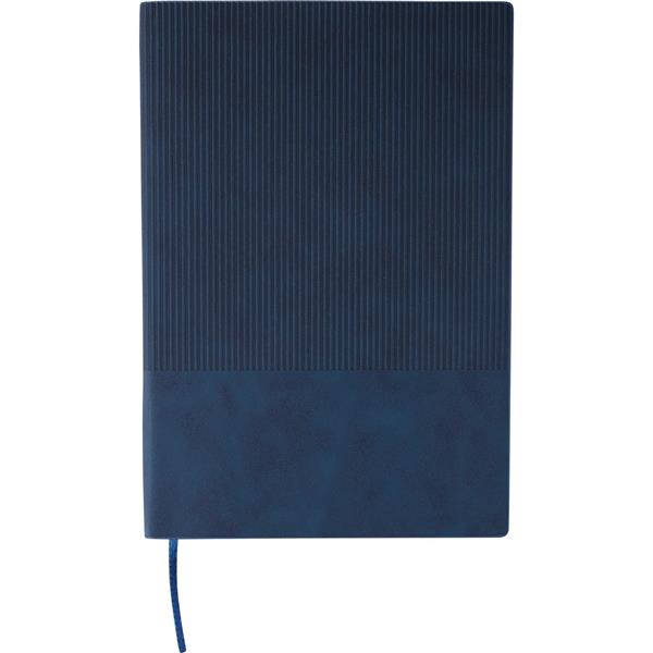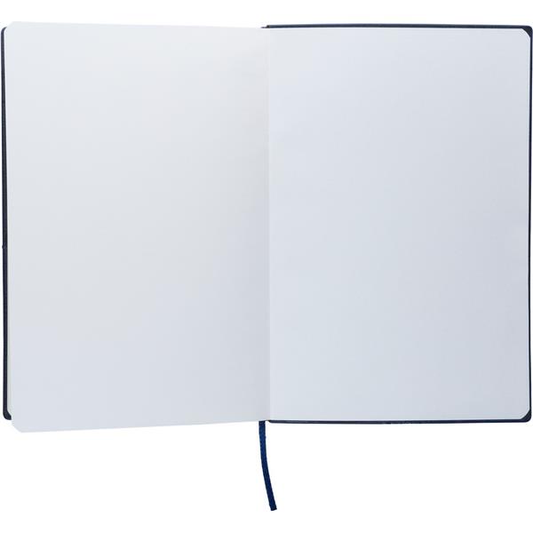 Notatnik ok. A5, 100 stron w linię (80 g/m2), twarda okładka, tasiemka zakładkowa umożliwia wygodne zaznaczanie ostatniej strony lub ważniejszych notatek, wykończenie przypominające sztruks, ikona recyklingu na produkcie, produkt wykonany z PU