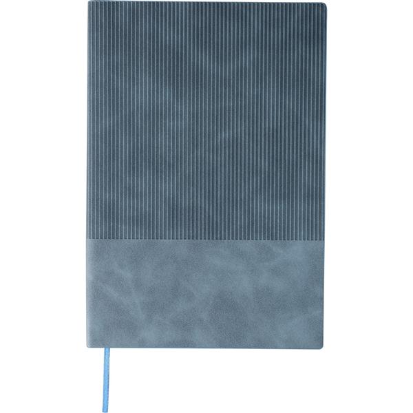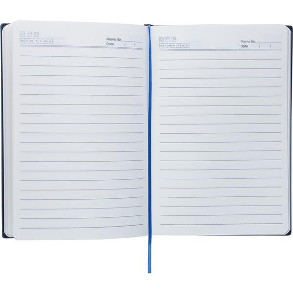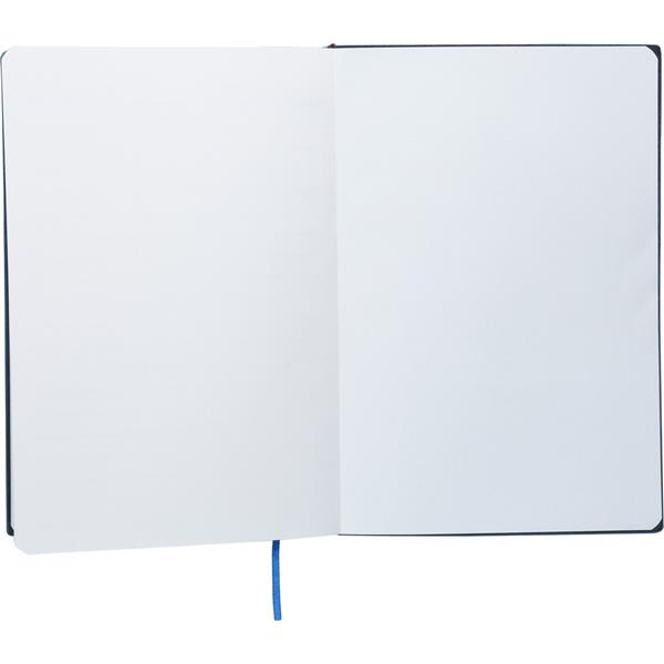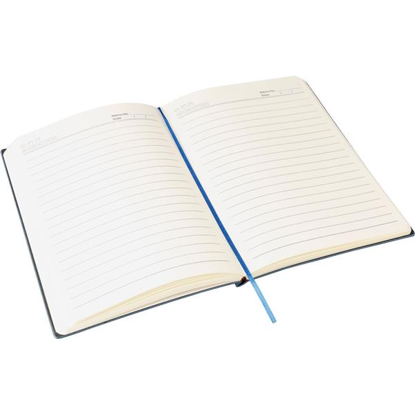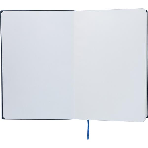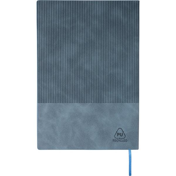 Notatnik ok. A5, 100 stron w linię (80 g/m2), twarda okładka, tasiemka zakładkowa umożliwia wygodne zaznaczanie ostatniej strony lub ważniejszych notatek, wykończenie przypominające sztruks, ikona recyklingu na produkcie, produkt wykonany z PU