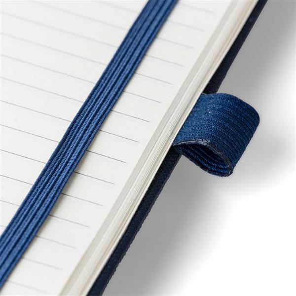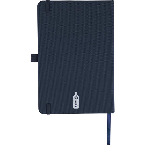 Notatnik w formacie A5, 70 g/m2, posiada 70 kartek w linie, tasiemka zakładkowa umożliwia wygodne zaznaczanie ostatniej strony lub ważniejszych notatek, dodatkowe zamknięcie w postaci dopasowanej kolorystycznie elastycznej opaski, sznurek do przywiązania długopisu, ikona recyklingu z tyłu, produkt wykonany z RPET 600D i papieru