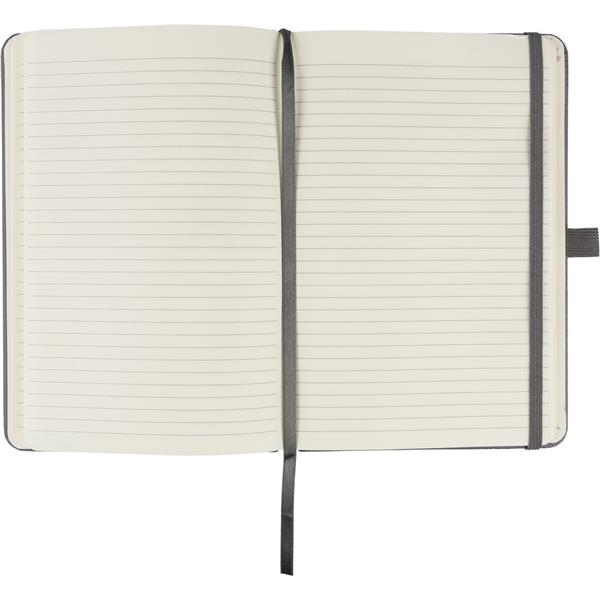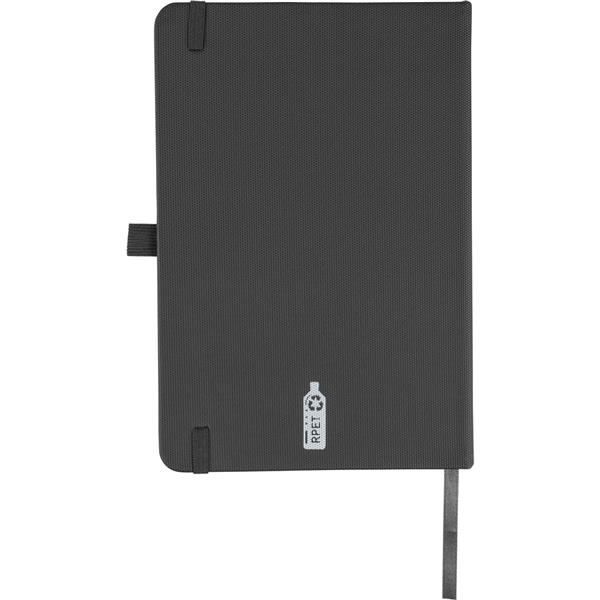 Notatnik w formacie A5, 70 g/m2, posiada 70 kartek w linie, tasiemka zakładkowa umożliwia wygodne zaznaczanie ostatniej strony lub ważniejszych notatek, dodatkowe zamknięcie w postaci dopasowanej kolorystycznie elastycznej opaski, sznurek do przywiązania długopisu, ikona recyklingu z tyłu, produkt wykonany z RPET 600D i papieru