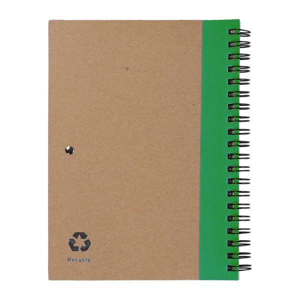Notatnik w formacie ok. A5, posiada 60 kartek w linie (120 stron) i spiralne bindowanie, w komplecie znajduje się długopis z kolorowymi elementami, wkład w niebieskim kolorze, okładka wykonana z kartonu z kolorowym elementem przy bindowaniu