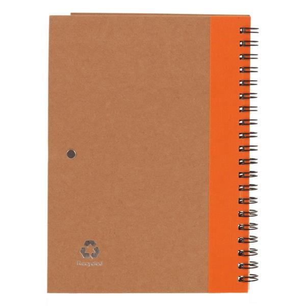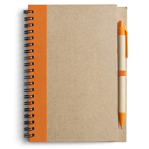 Notatnik w formacie ok. A5, posiada 60 kartek w linie (120 stron) i spiralne bindowanie, w komplecie znajduje się długopis z kolorowymi elementami, wkład w niebieskim kolorze, okładka wykonana z kartonu z kolorowym elementem przy bindowaniu