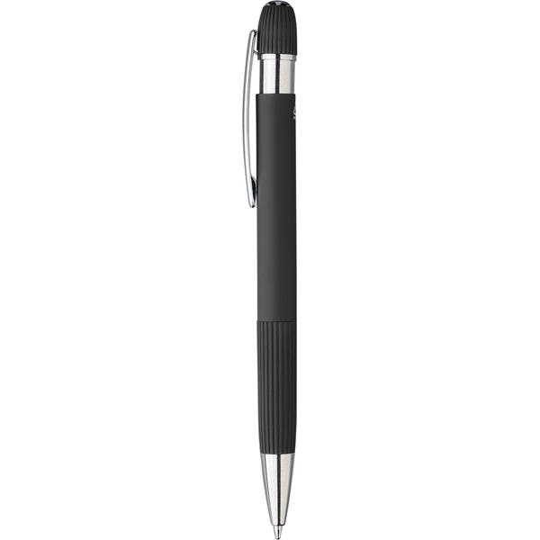 Notatnik ok A5, 100 stron w linie (70 g/m2) z twardą okładką przypominającą sztruks, tasiemka zakładkowa umożliwia wygodne zaznaczanie ostatniej strony lub ważniejszych notatek, długopis w komplecie, gumowe wykończenie, paskowane detale na trzonie i w górnej części, chromowana plastikowa końcówka, ikona recyklingu na obu produktach, zapakowane w brązowe kartonowe pudełko, produkt wykonany z PU i metalu