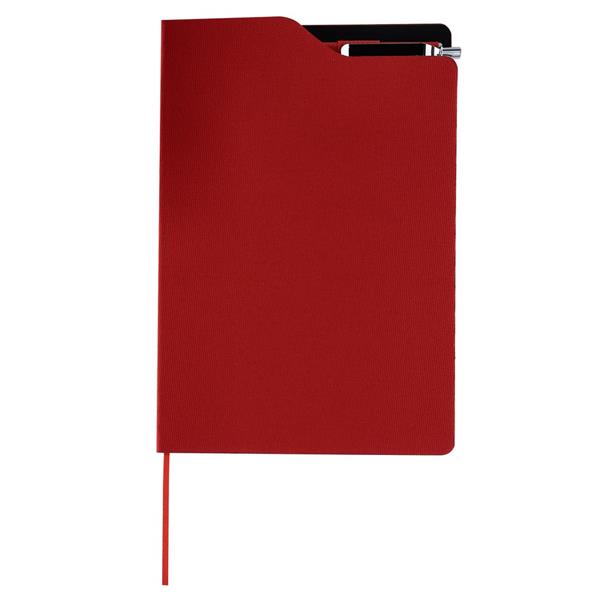Notatnik ok. A5, posiada 80 kartek w linie, tasiemka zakładkowa umożliwia wygodne zaznaczanie ostatniej strony lub ważniejszych notatek, twarda okładka, długopis z wkładem w niebieskim kolorze, produkt wykonany z poliestru 300D