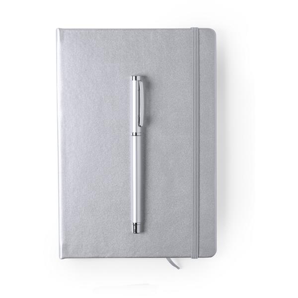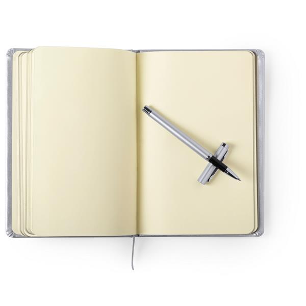 Notatnik (ok. A5, 80 pustych kartek), twarda okładka, tasiemka zakładkowa i elastyczna opaska do zamykania, pióro kulkowe w komplecie, w pudełku podarunkowym