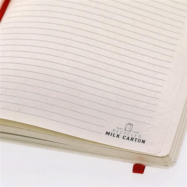 Notatnik ok. A5, posiada 80 kartek w linie, tasiemka zakładkowa umożliwia wygodne zaznaczanie ostatniej strony lub ważniejszych notatek, dodatkowe zamknięcie w postaci kolorowej elastycznej opaski, twarda okładka, produkt wykonany ze zrecyklingowanych kartoników po mleku