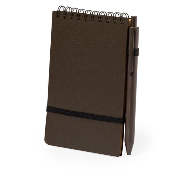 Notatnik (ok. A6, 70 kartek w linie), miękka okładka wykonana z łusek kawowych, długopis w komplecie, wkład długopisu w niebieskim kolorze
