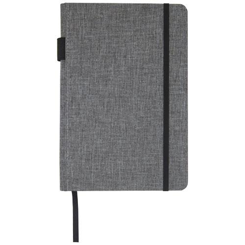 Notatnik w formacie A5 z okładką wykonaną z materiału RPET. Posiada 96 arkuszy w linie o gramaturze 70 g/m2 z papieru z recyclingu, pętelkę na pióro i wstążkę. Pakowany w kartonowe opakowanie.