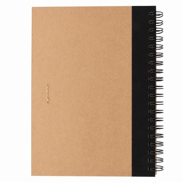 Notatnik (70 kremowych kartek z papieru makulaturowego 70 g/m2 w linie), spiralne bindowanie, dopasowany kolorystycznie długopis z papieru kraftowego w komplecie, niemiecki wkład Dokumental® w kolorze niebieskim w komplecie, długość pisania ok. 600 m, ślad węglowy produktu: 0,33 kg CO2