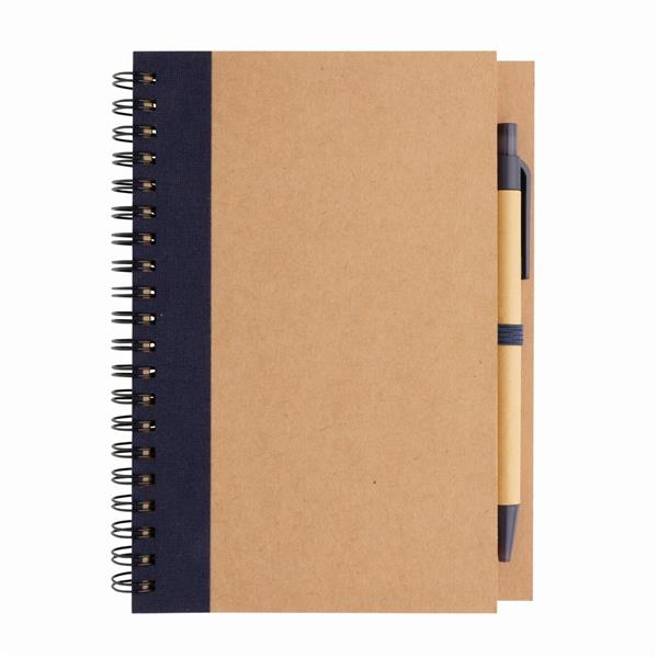 Notatnik (70 kremowych kartek z papieru makulaturowego 70 g/m2 w linie), spiralne bindowanie, dopasowany kolorystycznie długopis z papieru kraftowego w komplecie, niemiecki wkład Dokumental® w kolorze niebieskim w komplecie, długość pisania ok. 600 m, ślad węglowy produktu: 0,33 kg CO2