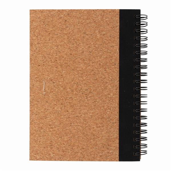 Notatnik (70 kremowych kartek z papieru makulaturowego 70 g/m2 w linie), korkowa okładka, spiralne bindowanie, dopasowany kolorystycznie długopis z papieru kraftowego w komplecie, niemiecki wkład Dokumental® w kolorze niebieskim w komplecie, długość pisania ok. 600 m, ślad węglowy produktu: 0,34 kg CO2