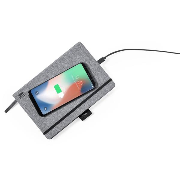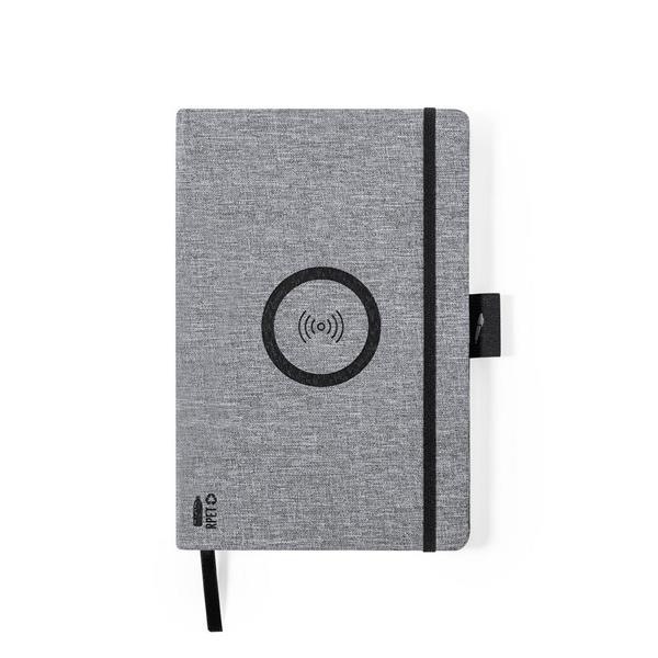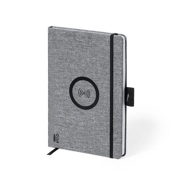 Notatnik A5 (80 kartek w linie), wykonany z RPET, ładowarka bezprzewodowa 10W, działa z telefonami posiadającymi możliwość ładowania indukcyjnego, elastyczna opaska do zamykania, twarda okładka