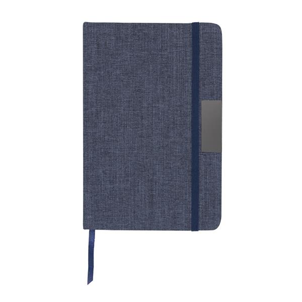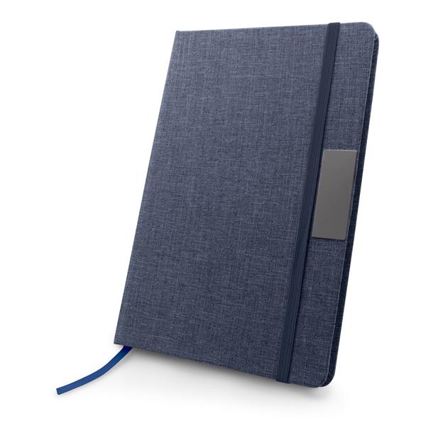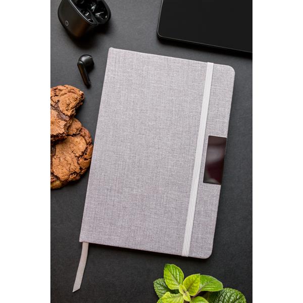 Notatnik w formacie A5, posiada 80 kartek w linie (160 stron), dodatkowe zamknięcie w postaci dopasowanej kolorystycznie elastycznej opaski, posiada metalowy element na grawerunek logotypu lub hasła, twarda okładka wykonana z RPET