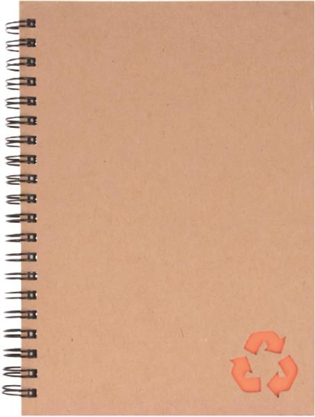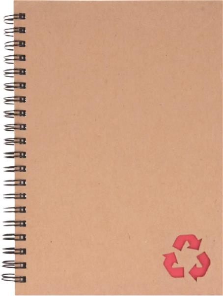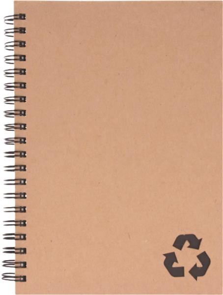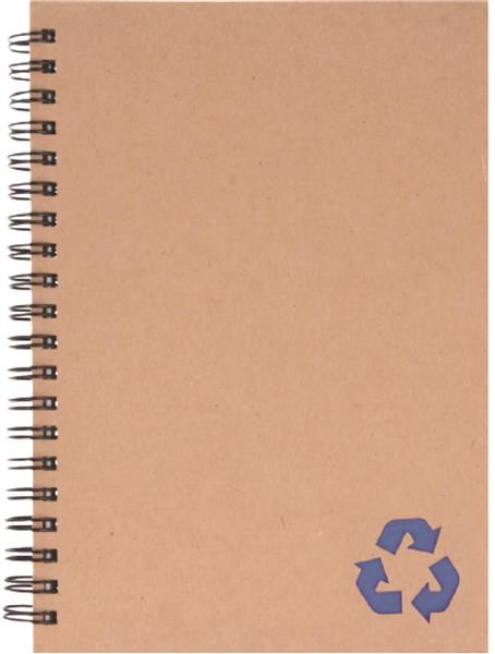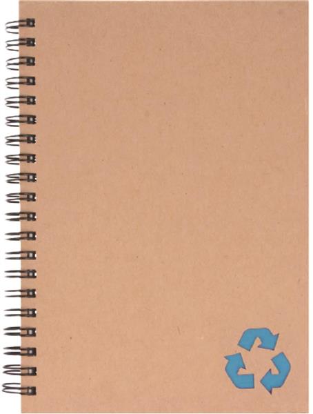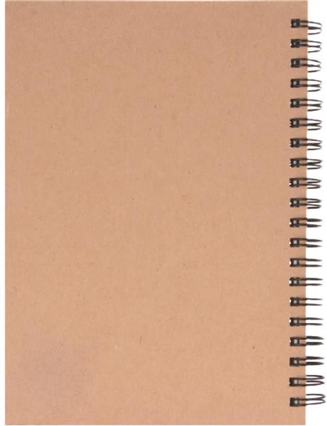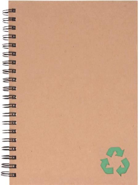 Notatnik z okładką z kartonu z recyklingu. Podwójna spirala. 140 stron w linie z papieru mineralnego (70 arkuszy). Papier mineralny jest wykonany z węglanu wapnia i HDPE (żywicy polietylenowej) stosowanej jako spoiwo. Jest wodoodporny i odporny na tłuszcz.