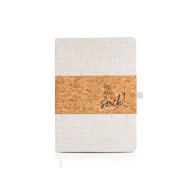 Piękny notes A5, którego okładka pokryta jest lnem oraz korkiem. 128 gładkich stron.