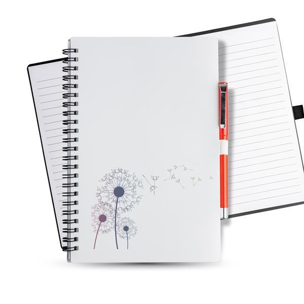 Notes A5, którego okładka wykonana jest z PP. Zawiera 140 stron w linie oraz elastyczny uchwyt na długopis. Rozmiar: 21 x 14 x 0,8 cm S1 (sitodruk): 10 x 15 cm T3 (tampodruk): 5 x 3 Kolor: Czarny