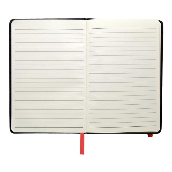 Notes A5 z okładką teksturowaną ze skóry PU, z 96 kartkami w linie i kolorową gumką, zakładką i uchwytem na długopis.