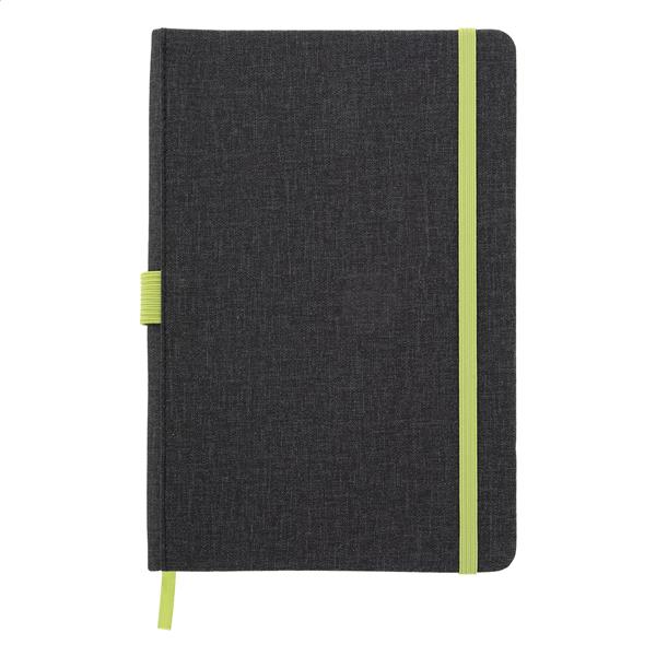 Notes A5 z okładką teksturowaną ze skóry PU, z 96 kartkami w linie i kolorową gumką, zakładką i uchwytem na długopis.
