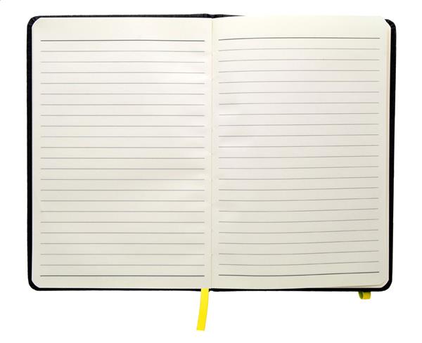 Notes A5 z okładką teksturowaną ze skóry PU, z 96 kartkami w linie i kolorową gumką, zakładką i uchwytem na długopis.