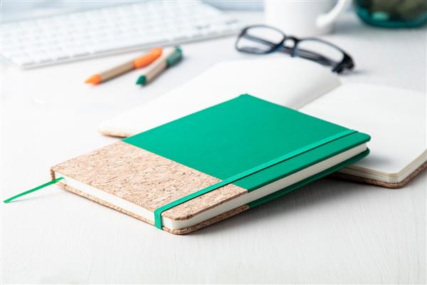 Notes z naturalnego korka i skóry PU z zamknięciem na gumkę i 98 czystymi stronami. Rozmiar A5.