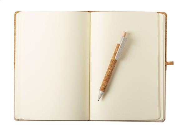 Notes A5 z okładką z naturalnego korka i bawełny z 80 gładkimi kartkami. Zawiera długopis z korka z elementami plastikowymi ze słomy pszenicznej i czarnym wkładem.