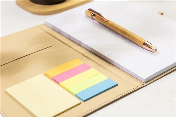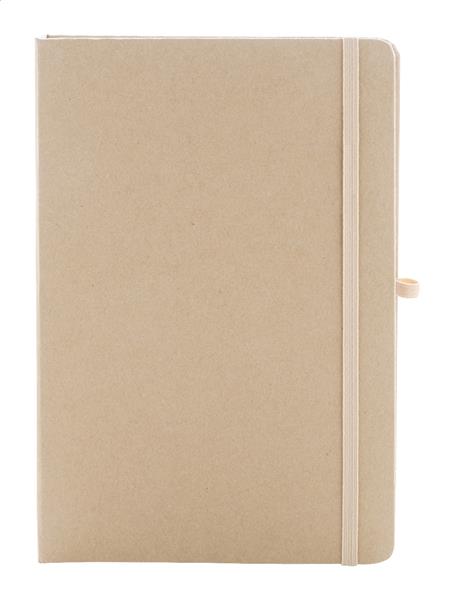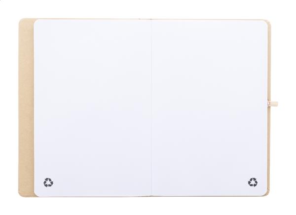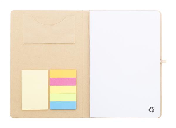 Notes w okładce z recyklingowanego kartonu, z 70 czystymi kartkami z papieru z recyklingu. Wewnątrz okładka zawiera 25 karteczek samoprzylepnych, 125 zakładek i kieszonkę na karty. Z gumowym paskiem i uchwytem na długopis. Format A5.