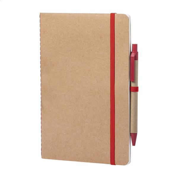 Notes A5 z 60 czystymi kartkami, z tekturową okładką i kolorową gumką. W zestawie długopis z plastiku ze słomy pszenicznej z niebieskim wkładem.