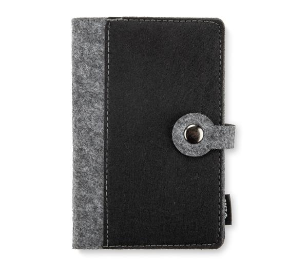 Poręczny zeszyt A6 EVERO wykonany z filcowanego materiału rPET. Zapinany na guzik, z kartkami w kratkę, idealnie sprawdzi się w podróży czy na spotkaniach. Dzięki poręcznemu formatowi bez problemu zmieści się w torbie, nie zajmując dużo miejsca. Jest lekki i praktyczny, dlatego doskonale nadaje się jako gadżet firmowy lub element pakietu powitalnego.