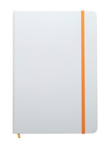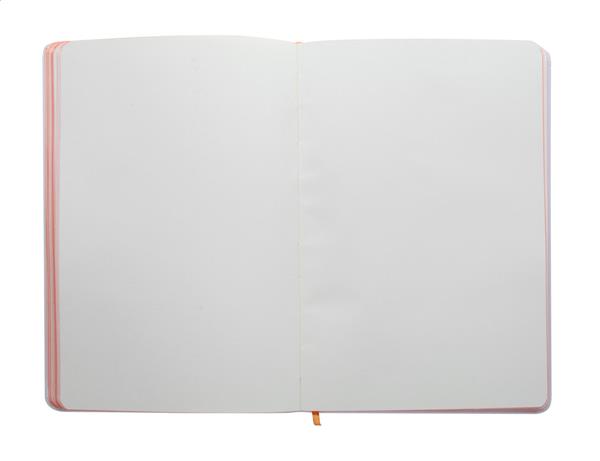 Notes A5 z papierową okładką, ze 100 gładkimi kartkami, kolorową gumką, tasiemką i krawędziami kartek w tym samym kolorze.