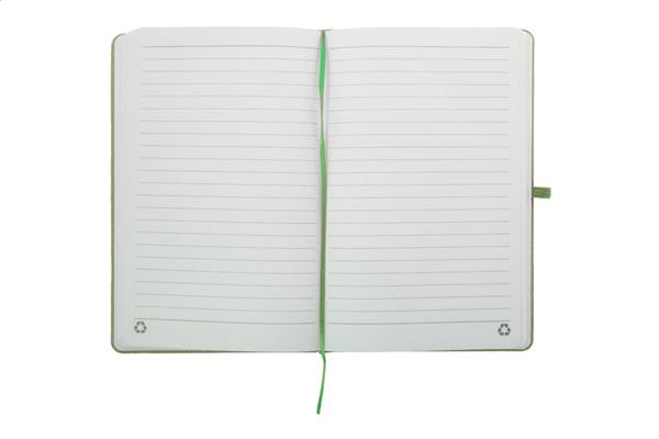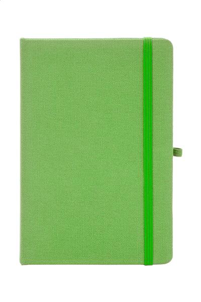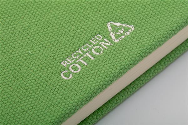 Notes z okładką z bawełny z recyklingu, 80 kartek w linie z papieru z recyklingu. Z dopasowaną kolorystycznie zakładką, gumką i uchwytem na długopis. Rozmiar A5.