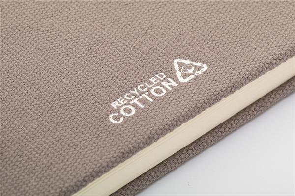 Notes z okładką z bawełny z recyklingu, 80 kartek w linie z papieru z recyklingu. Z dopasowaną kolorystycznie zakładką, gumką i uchwytem na długopis. Rozmiar A5.