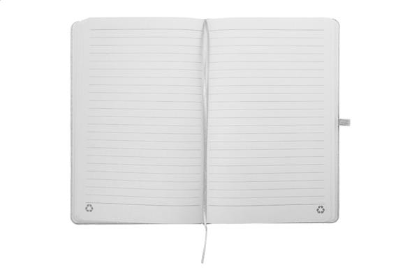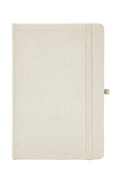 Notes z okładką z bawełny z recyklingu, 80 kartek w linie z papieru z recyklingu. Z dopasowaną kolorystycznie zakładką, gumką i uchwytem na długopis. Rozmiar A5.