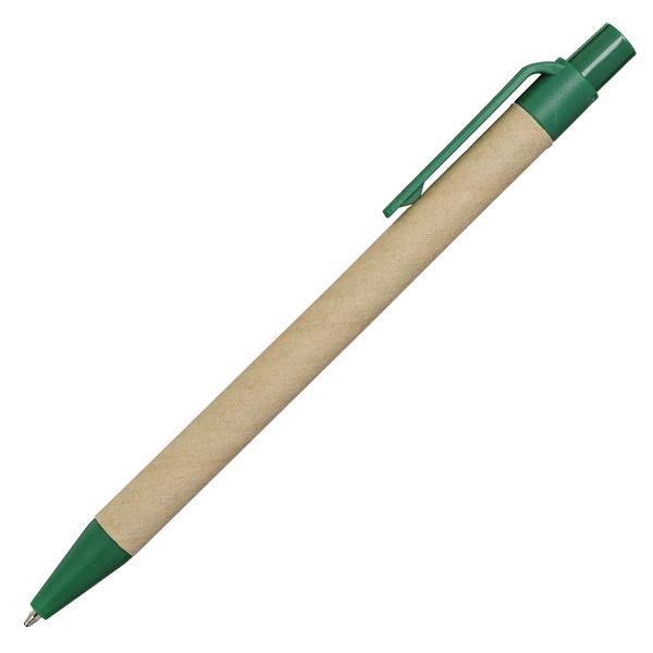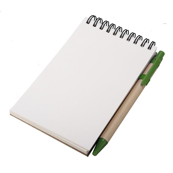 Notes z długopisem z 70 gładkimi kartkami. Karton użyty przy produkcji notesu i długopisu pochodzi z surowców wtórnych i mogą podlegać ponownemu przetworzeniu. Produkt wyprodukowano zgodnie z zasadami gospodarki niskoemisyjnej i przy użyciu małej ilości wody. Wkład w kolorze niebieskim.