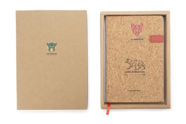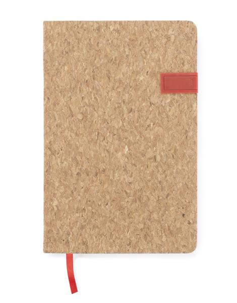 Notes w twardej korkowej oprawie. W okładce została umieszczona pamięć USB o pojemności 16 GB. Zawiera 80 kartek w linie. Kartki w notesie wyprodukowane z papieru.