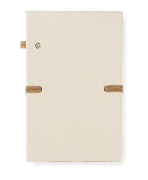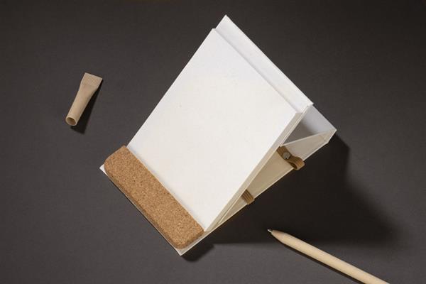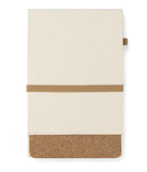 Okładka i kartki w notesie zostały wyprodukowane z kartonów po mleku. Okładka zamykana za pomocą elastycznej gumki. Korkowy element dopełnia ten produkt wizualnie, a także umożliwia stworzenie z notesu stojaka na telefon. Notes posiada 80 gładkich kartek.