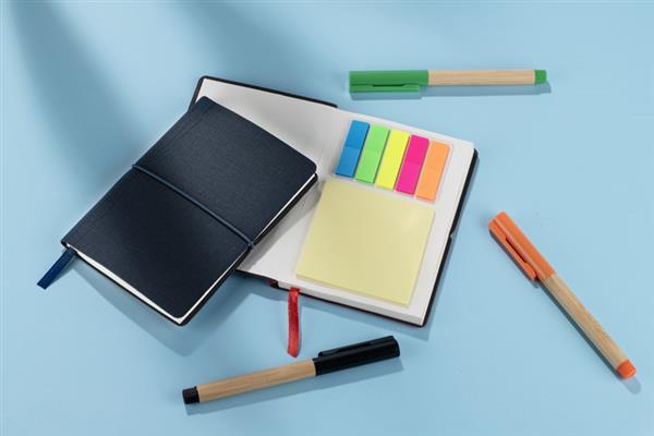 Notes POSTI w formacie A6 to kompaktowy i funkcjonalny notatnik, który doskonale sprawdzi się w biurze, podczas spotkań lub w podróży. Zawiera kartki w linie, żółte karteczki samoprzylepne oraz kolorowe zakładki indeksujące, dzięki którym łatwiej uporządkujesz notatki i zadania. Zamykanie na elastyczną gumkę zabezpiecza zawartość, a lekka forma sprawia, że bez problemu zmieści się w torbie lub plecaku. Praktyczny i gotowy do znakowania – idealny jako gadżet reklamowy.