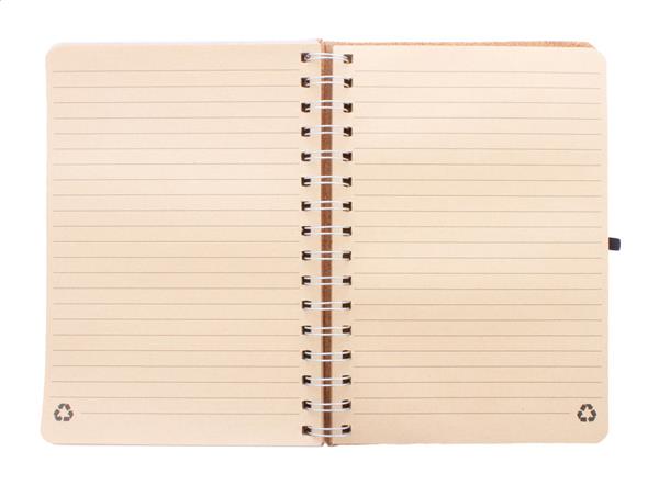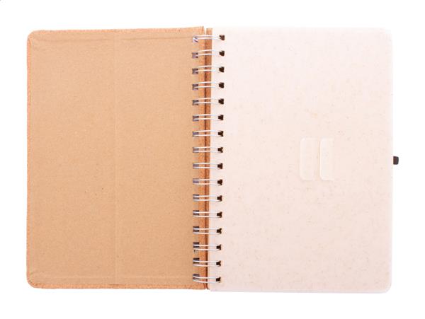 Notes spiralny pokryty naturalnym korkiem z podstawą na telefon i uchwytem na tablet ze słomy pszenicznej. Z 70 kartkami w linie z papieru kraft z recyklingu, gumowym paskiem i uchwytem na długopis. Rozmiar A5.