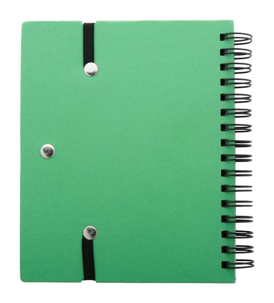 Notes spiralny z papieru pochodzącego z recyklingu, zawierający 70 kartek w linie i 125 zakładek (w 5 różnych kolorach). Z gumką i uchwytem na długopis. Rozmiar A6. Zawiera długopis z papieru pochodzącego z recyklingu z niebieskim wkładem.