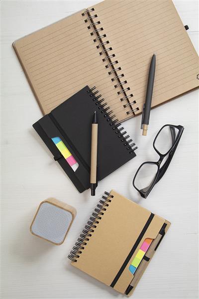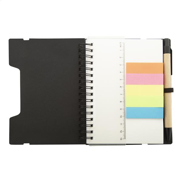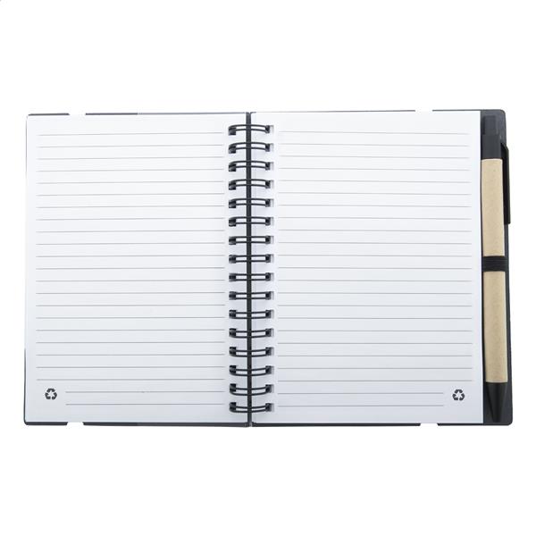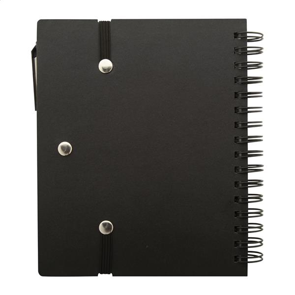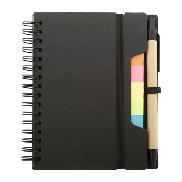 Notes spiralny z papieru pochodzącego z recyklingu, zawierający 70 kartek w linie i 125 zakładek (w 5 różnych kolorach). Z gumką i uchwytem na długopis. Rozmiar A6. Zawiera długopis z papieru pochodzącego z recyklingu z niebieskim wkładem.