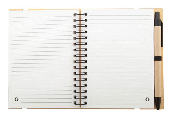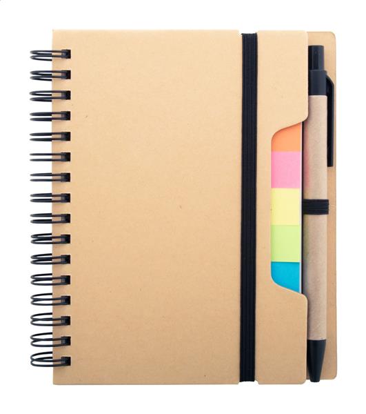 Notes spiralny z papieru pochodzącego z recyklingu, zawierający 70 kartek w linie i 125 zakładek (w 5 różnych kolorach). Z gumką i uchwytem na długopis. Rozmiar A6. Zawiera długopis z papieru pochodzącego z recyklingu z niebieskim wkładem.