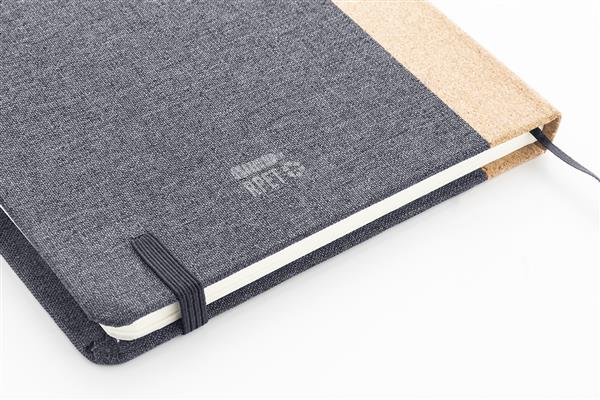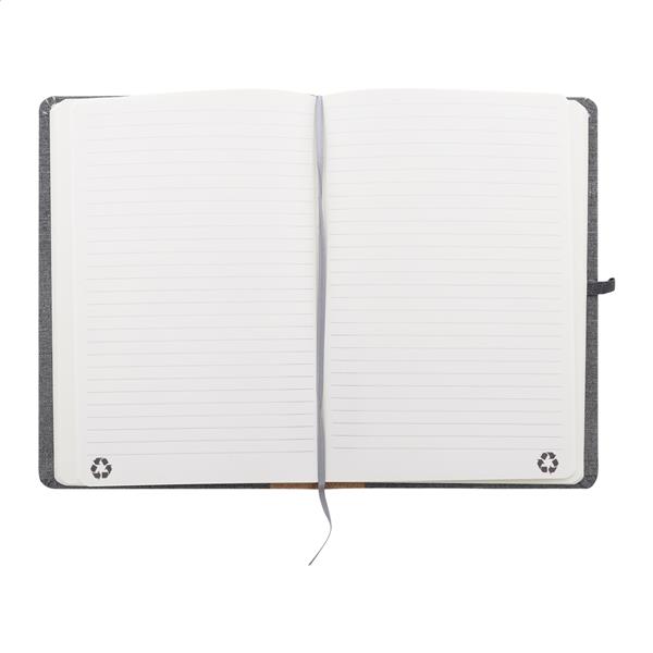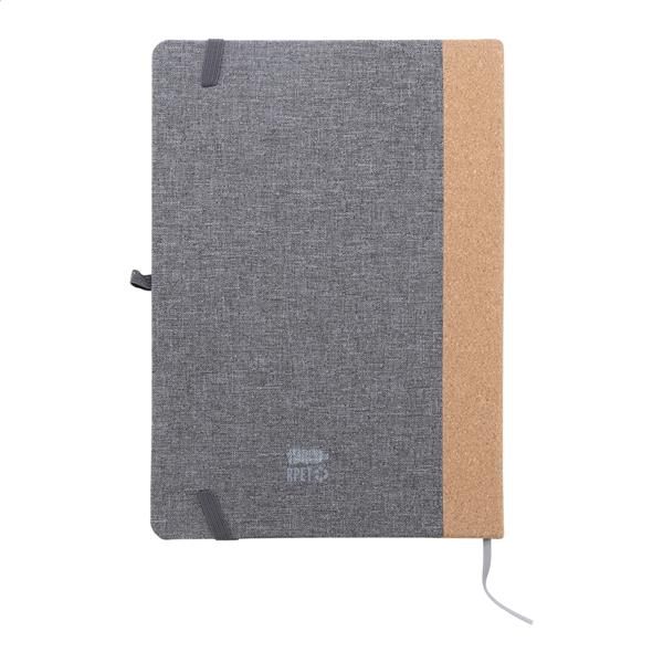 Notes z okładką z poliestru RPET z naturalnym korkowym grzbietem i 80 kartkami w linie z papieru pochodzącego z recyklingu. Z zakładką, gumowym paskiem i uchwytem na długopis. Rozmiar A5.
