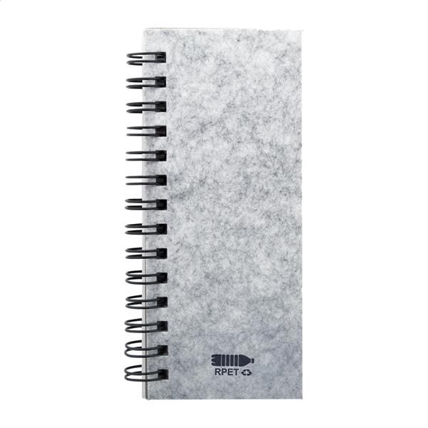 Notes spiralny RPET, pokryty filcem, zawierający 40 kartek w linie z papieru pochodzącego z recyklingu, 25 karteczek samoprzylepnych i 125 zakładek (w 5 różnych kolorach).