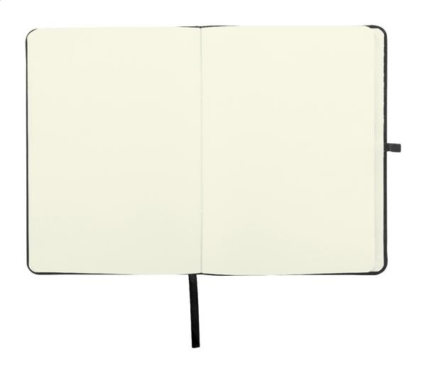 Notes w okładce z poliestru RPET, ze 100 gładkimi kartkami. Z dopasowaną kolorystycznie gumką, zakładką i uchwytem na długopis. Rozmiar A5.