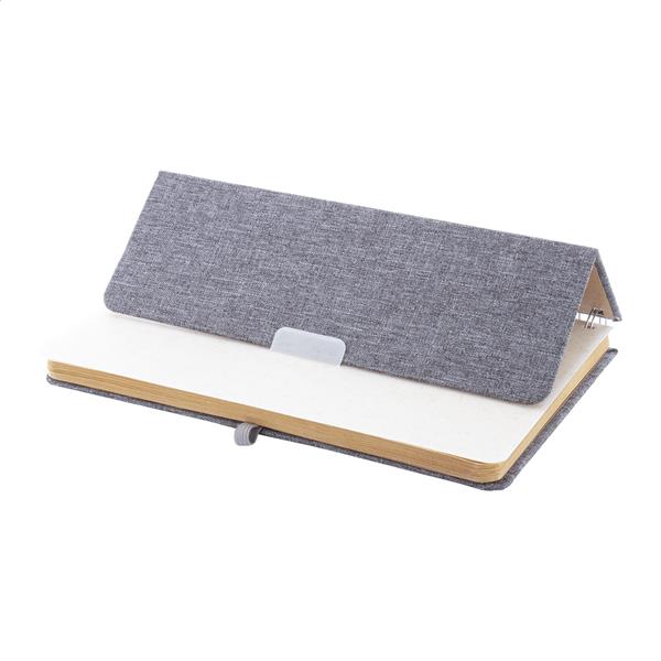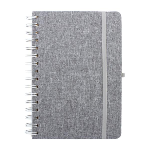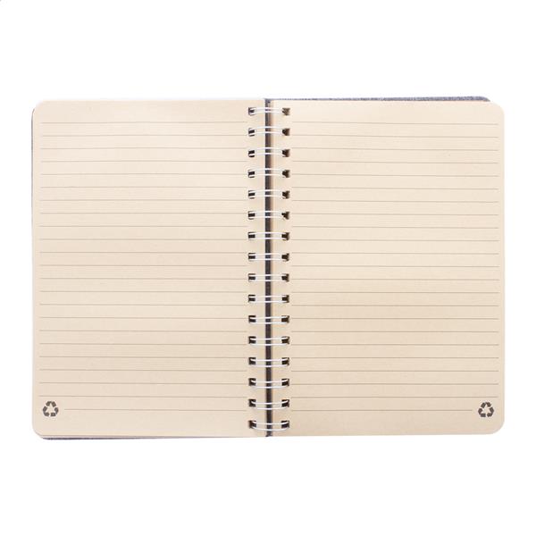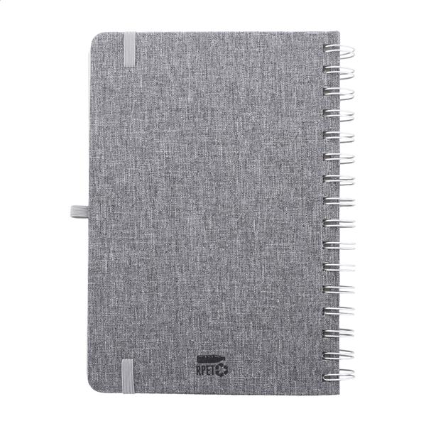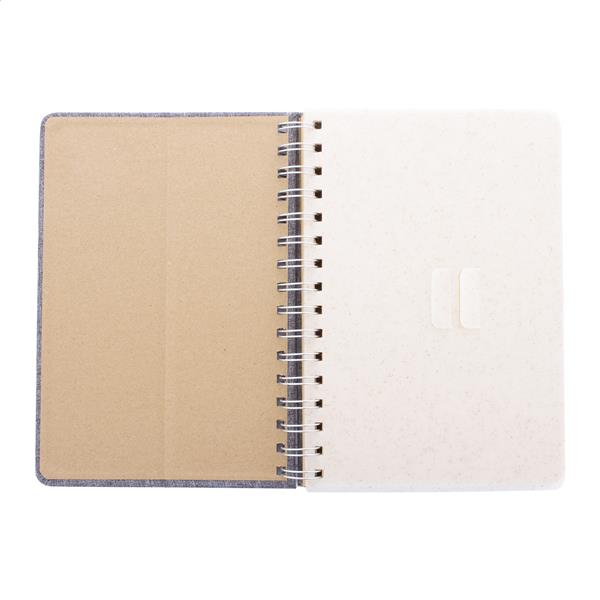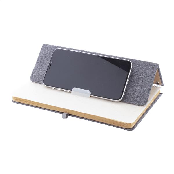 Notes spiralny pokryty poliestrem RPET z podstawą na telefon i uchwytem na tablet. Z 70 kartkami w linie z papieru kraft z recyklingu, gumowym paskiem i uchwytem na długopis. Rozmiar A5.